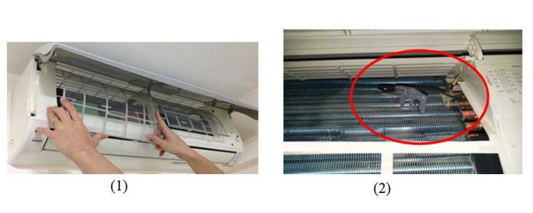 همان طور که در شکل بالا ملاحظه میفرماییدجهت دراوردن فیلتر کولر گازی ابتدا قاب روی پنل کولر گازی را از گوشه های پایین گرفته و به طرف بیرون میکشیم تا قاب باز شود بعد قسمت پایین فیلترها را کمی بالا برده و به طرف بیرون میکشیم تا فیلترها بیرون آیند. لازم بذکر است جهت شستشوی فیلترها آب تحت فشار کفایت میکند.