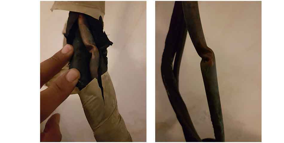 تصاویری که در بالا مشاهده میفرمایید لوله برگشت گاز کولر گازی میباشد که به خاطر سهل انگاری نصاب هنگام نصب کولر گازی ، لوله ها از چند مقطع دوپهن یا خم شده اند. این امر باعث شده تا گاز داخل کولر گازی افت فشار پیدا کند ، مصرف برق کولر گازی افزایش یابد ، سرمایش کولر گازی کاهش پیدا کرده و در نهایت به خاطر کار کردن کولر گازی در این شرایط ، کمپرسور کولر که گرانترین قطعه کولر گازی میباشد بسوزد و کاملا از کار بیفتد.