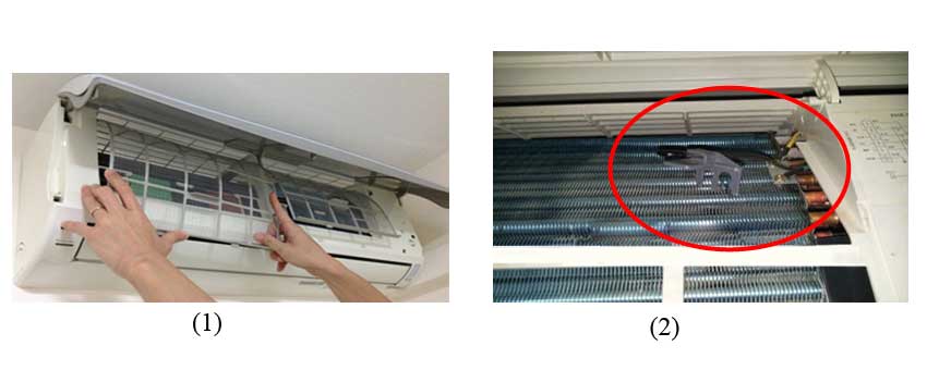 همان طور که در شکل بالا ملاحظه میفرماییدجهت دراوردن فیلتر کولر گازی ابتدا قاب روی پنل کولر گازی را از گوشه های پایین گرفته و به طرف بیرون میکشیم تا قاب باز شود بعد قسمت پایین فیلترها را کمی بالا برده و به طرف بیرون میکشیم تا فیلترها بیرون آیند. لازم بذکر است جهت شستشوی فیلترها آب تحت فشار کفایت میکند.