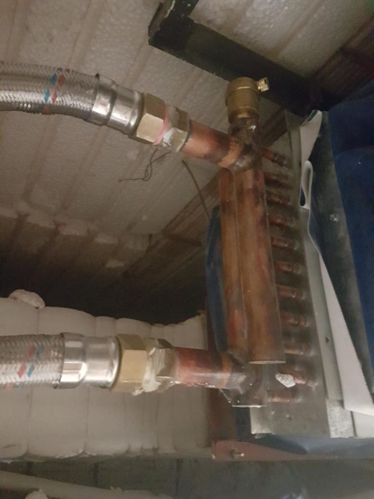 در تصویر بالا کویل آب گرم داکت اسپیلت را مشاهده میفرمایید که در یک سمت یونیت داخلی نصب شده و آب گرم توسط شیلنک ها از یک طرف وارد کویل شده و از طرف دیگر خارج میشود وقتی فن داکت اسپیلت در حال کار کردن است باد تولید شده به پره های کویل آب گرم برخورد کرده و گرما را وارد محیط میکند. لازم بذکر است آب گرم مورد نیاز داکت اسپیلت توسط پکیج و یا موتورخانه تامین میشود.