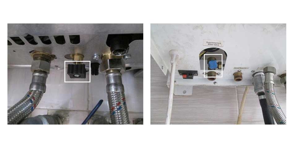 2– با توجه به اینکه زیر پکیج 4 عدد شیلنک رفت و برگشت آب وجود دارد و هر کدام از آنها یک فلکه دارد شیلنکی که ورودی آب شهری پکیج میباشد فلکه آن را کاملا سفت میکنیم تا از ورود آب به پکیج جلوگیری شود.
