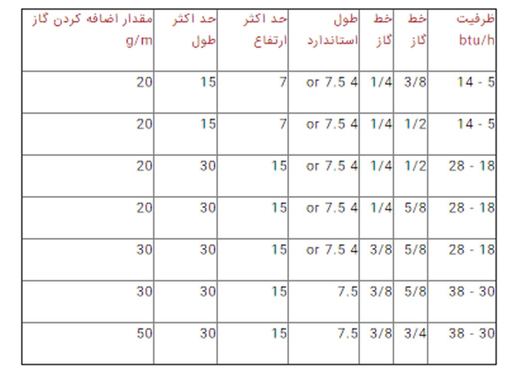حداکثر طول لوله کشی کولر گازی ، نسبت به قدرت و ظرفیت کولر گازی ، همچنین نسبت به سایز شیرهای کولر گازی متفاوت است که در جدول زیر به آن اشاره شده است.